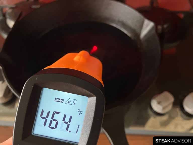 To get that rich, black crust, the steak needs to hit a very hot surface. Aim for a pan temperature of at least 400°F (204°C) for the best results. That’s why using the right pan and a high–smoke point oil is so important. Use a high–smoke point oil and a heavy, heat-retaining pan. A cast-iron skillet is ideal, but carbon steel or a heavy-bottomed stainless steel pan will also work. As for oil or fat, refined avocado oil is my go-to, though I’ve listed a few other high–smoke point options below that work just as well.