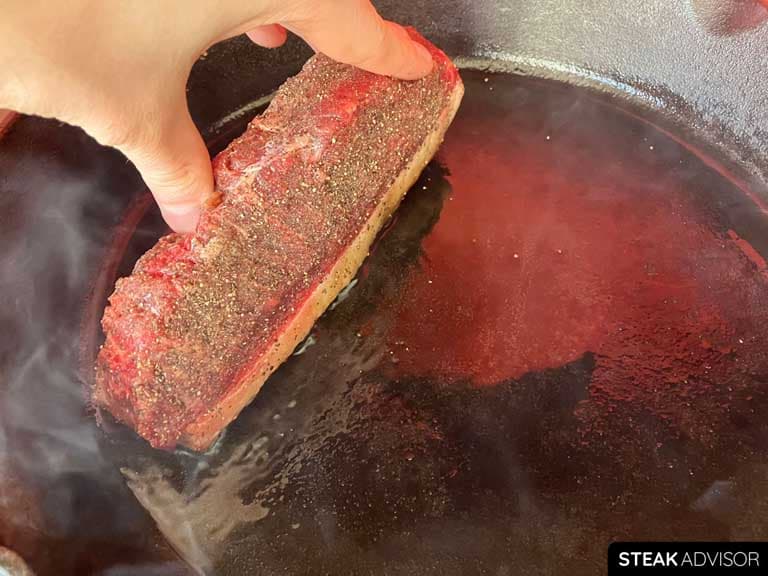 Add the butter only after the steak’s internal temperature reaches about 90°F (32°C), then reduce the heat to medium-low. Adding it earlier increases the risk of burning, since butter’s smoke point is only about 300°F (149°C). Burnt butter adds bitterness, not rich flavor, and it’s one of the easiest ways to ruin a perfectly cooked steak.