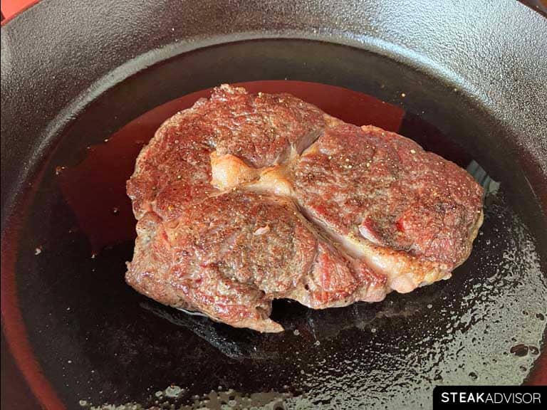 A hot pan is the key to a proper sear. The Maillard reaction (browning) speeds up dramatically when the steak’s surface reaches approximately 300°F (150°C). Because the pan cools the moment the steak hits it and any surface moisture holds the temperature near 212°F (100°C) until it evaporates, preheat the skillet hotter. Aim for about 450°F (232°C) so the surface stays hot enough for a hard sear. In my tests with a cast-iron skillet, 4-5 minutes of preheating usually brings it right into that range.